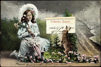 Glückwunsch Ostern, Mädchen Hält Kniened Blumen, Hase