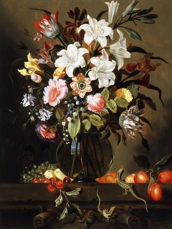 A Bouquet of Flowers with Fruit and Two Sand Lizards on a Stone Ledge, 1647