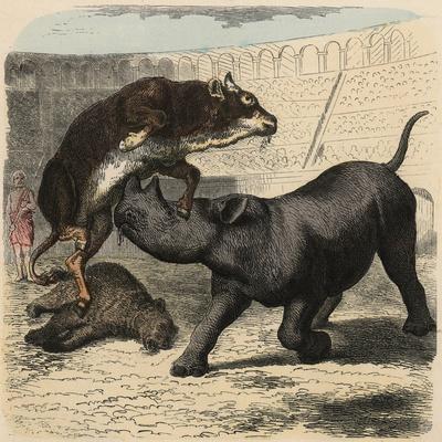 Ancient Rome: Animals fighting in the amphitheatre, 1866 (coloured engraving) Coloured engraving by Heinrich Leutemann (1824-1905) - Bilder aus dem Altertume (Pictures from Antiquity) 1866
