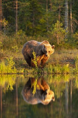 Eurasian brown bear (Ursus arctos arctos) in evening sunlight, reflected in lake, Kuhmo, Finland