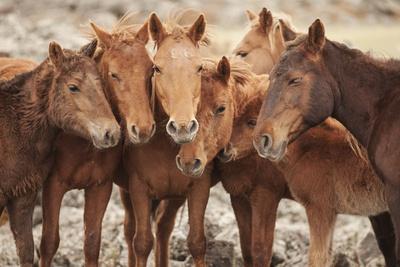 Semi-wild Mongolian horses keeping close in the Mongolian steppes, Mongolia, Central Asia, Asia