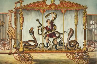 The Snake Wagon, with a snake performer at a circus, circa 1874.