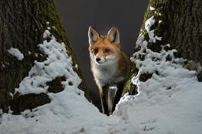 Red fox vixen standing in fork of tree on snowy night, Hungary