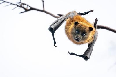 Grey-headed flying-fox bat hanging upside down from branch