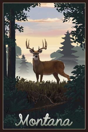 Montana - Deer & Sunrise - Script Lettering - Lantern Press Artwork