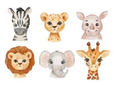 Cute Portraits Cheetah, Giraffe, Elephant and Zebra in Cartoon Style. Drawing African Baby Wild Cat
