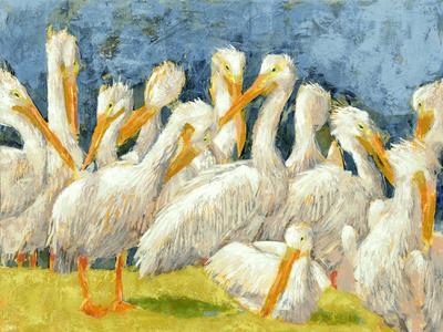 painting, coastal, beach, whimsical, animals, birds, pelicans, water birds, coastal birds, white, blue, green