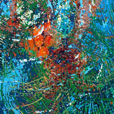 painting, abstract, water, palm tree, tropical, coastal, blue green, orange