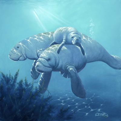 painting, wildlife, manatees, baby manatee, calf, blue, ocean, water, underwater, sea life, animals
