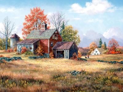 painting, landscape, nostalgic, vermont, new england, country, rural, farm, barn red barn, house, farmhouse, red pickup truck, vintage, antique, dog, figure, autumn, field, foliage, trees