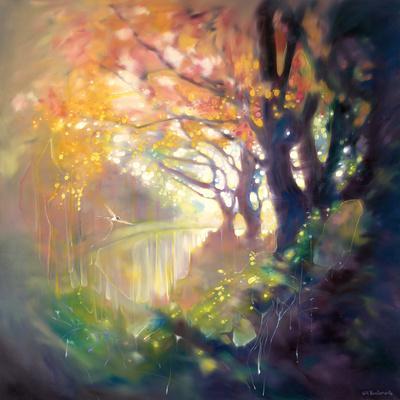 painting, whimsical, landscape, forest, trees, sunset, glow, autumn, water, river, creek