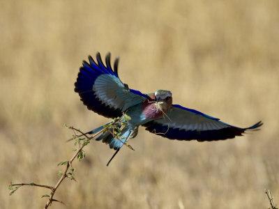 Lilac-Breasted Roller Landing with a Grasshopper in its Beak, Masai Mara National Reserve, Kenya