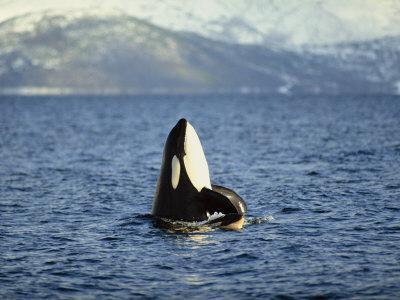 Killer Whale Spy Hopping with Calf in an Arctic Fjord, Norway, Scandinavia, Europe