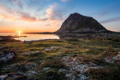 Scenic view with sunset and mountain at summer night in Lofoten, Norway